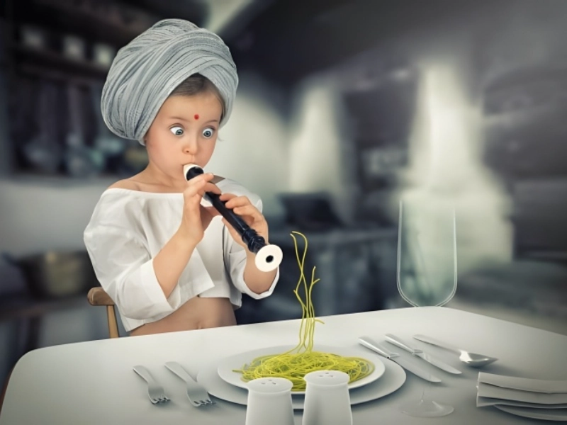 In this fanciful reinterpretation of classic snake charmer, spaghetti becomes the object of magical control. The idea deftly substitutes benign strands of spaghetti for deadly serpents, producing a wonderfully ridiculous situation whereby mealtime turns into a performance art. Maintaining the humorous illusion, the parenthetical reference to Photoshop’s help gives the spectator a knowing wink acknowledging the digital wizardry behind the scenario. By means of artistic digital modification, the image probably catches the fascinating arcs and swirls of regular pasta defying gravity and physics from the plate. Combining cultural references with everyday materials to create a distinctive and funny visual narrative, this inventive idea turns a basic dinner into an interesting show.