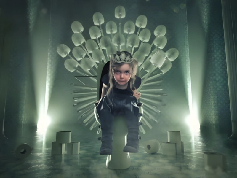 With “Game of Toilets” and “Westeroll” acting as smart puns, this creative parody deftly combines potty humour with pop culture allusions, so transforming the familiar fantasy realm into a bathroom-themed kingdom. Presumably taken on a toilet throne, the character Yuna Stark gives the royal stance usually connected with a funny dimension. Through inventive photography and computer manipulation, this creative interpretation shows how common objects may be turned into great props. The simple bathroom fixture’s juxtaposition with regal images produces a wonderful contrast that both respects the original source material and gently subverts it, therefore generating a distinctive and interesting visual narrative.