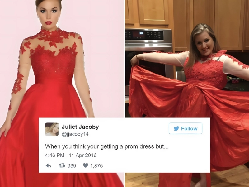 When a girl ordered a red prom dress online, she discovered the hard way. What was supposed to be a lovely, ruffled, crimson garment instead looked like a cheap, rumpled trash bag. I apologize, @jjacoby14. I wish you luck next time.