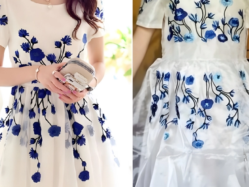 It’s difficult to determine if this failure justifies a spot on the list. Since the dress is fully embroidered, all of its components are technically present. Nevertheless, the garment (the terrible one) on the right does appear quite fragile and inexpensive.