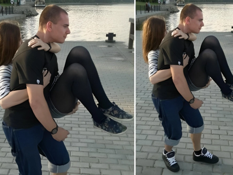 This picture, which was probably taken with a simple, outdated cell phone camera, is another instance of an optical illusion. This smart photo may initially cause you to see a variety of improbable scenes, like a woman carrying a male dressed in tights and short shorts.