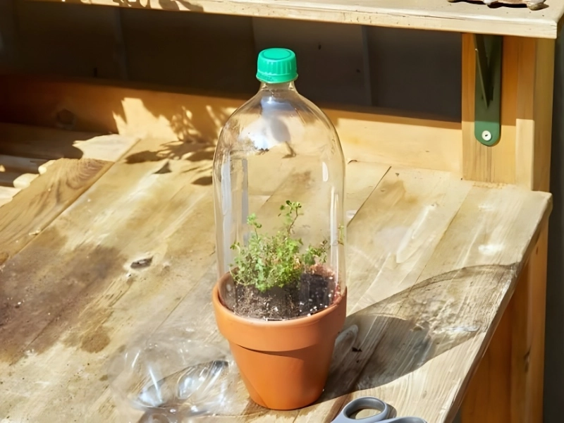 Retire el fondo de la botella y fíjela a la parte superior de una maceta que tenga plántulas plantadas en tierra. Se producirá un efecto invernadero debido a la carcasa de plástico. El microinvernadero se puede desmontar una vez que las semillas hayan brotado o los esquejes hayan echado raíces. Después de limpiarlo, colóquelo en su contenedor de reciclaje.