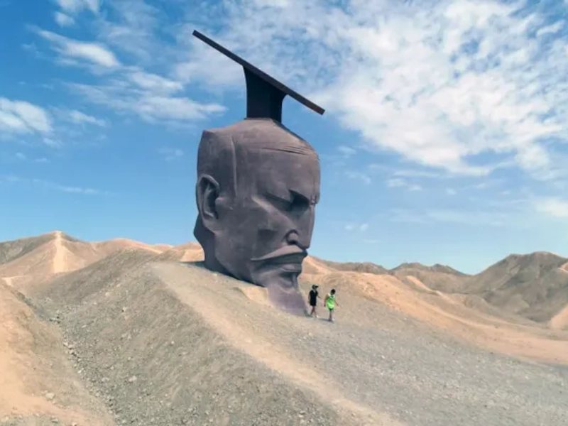 Eine 12,5 Meter hohe Skulptur des Kaisers Wu von Han in Guazhou. Das Hauptmaterial ist roter Sandstein, der mithilfe von 3D-Scanning und digitaler Technologie in Blöcke geschnitzt wurde