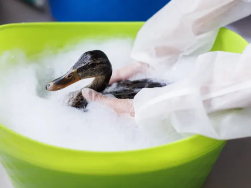In einem Wildtierzentrum in Toronto werden Enten in einem Seifenbad gereinigt. Nachdem ein Industriebrand in Etobicoke zu einer Kontamination von Mimico Creek geführt hatte, wurden fast 80 Enten behandelt und bei der Wohltätigkeitsorganisation Toronto untergebracht
