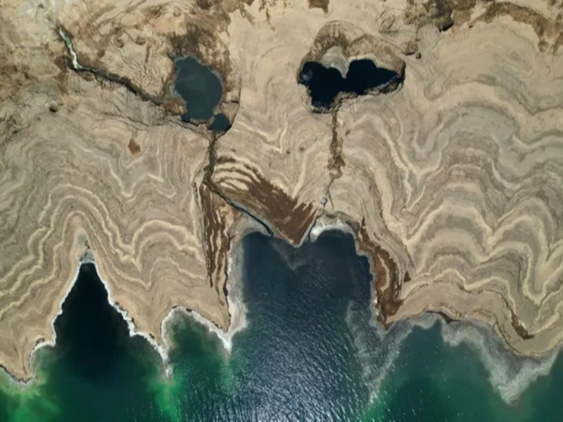 Ein Luftbild zeigt Muster aus kristallisierten Mineralien und Dolinen auf der Oberfläche eines ausgetrockneten Gebiets des Toten Meeres in der Nähe des südisraelischen Ferienortes Neve Zohar. Das Tote Meer hat seit 1960 ein Drittel seiner Oberfläche verloren, wobei das blaue Wasser jedes Jahr etwa einen Meter zurückgeht und eine vom Salz weißgeweißte und von klaffenden Löchern durchzogene Mondlandschaft zurücklässt