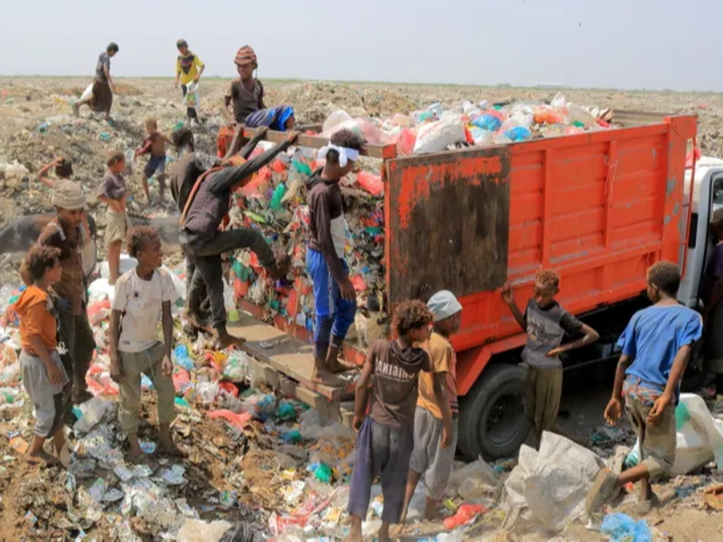 Jugendliche sammeln wiederverwertbare Gegenstände auf einer Mülldeponie in der Hafenstadt am Roten Meer im Jemen