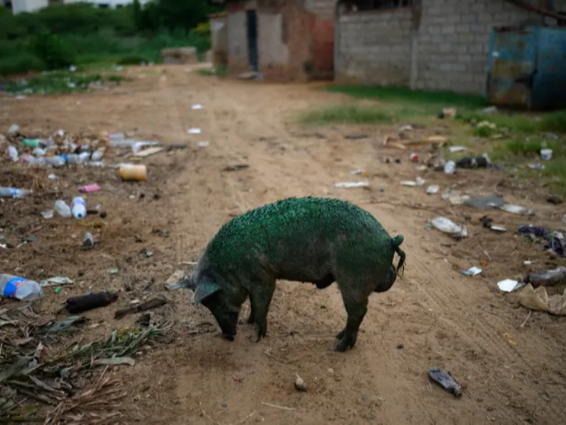 Ein mit einem dicken grünlichen Film bedecktes Schwein schnüffelt am Boden, während es in Ufernähe nach Nahrung sucht. Die Umweltverschmutzung rund um den Maracaibo-See, einen der größten Seen Lateinamerikas, ist das Ergebnis jahrzehntelanger Ölförderung, unzureichender Wartung und fehlender Investitionen zur Verbesserung einer bereits veralteten Infrastruktur, sagen Umweltschützer