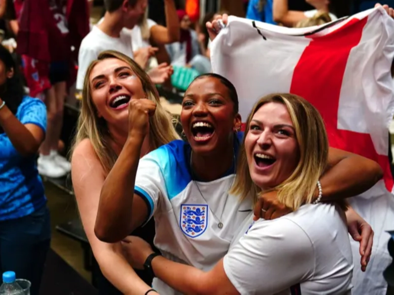 England-Fans feiern das zweite England-Tor, das Lauren Hemp während einer Vorführung des Halbfinales der FIFA Frauen-Weltmeisterschaft 2023 zwischen Australien und England erzielte