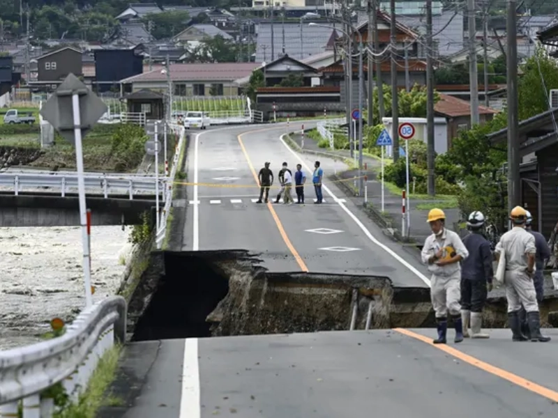 Arbeiter stehen auf einer eingestürzten Straße, nachdem der Taifun Lan das Gebiet getroffen hat
