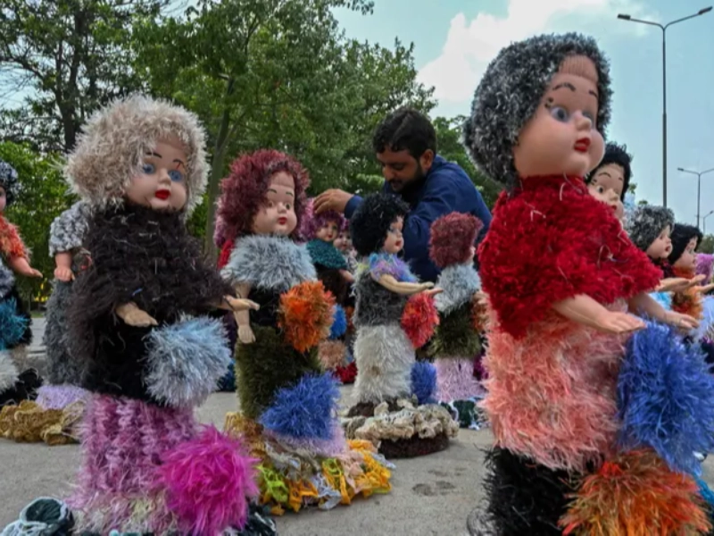 Ein Puppenverkäufer wartet am Straßenrand auf Kunden