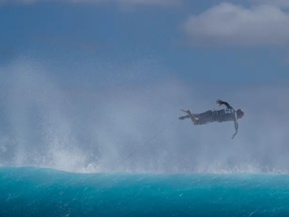 Die US-Surferin Kelly Slater springt während des World Surf League Shiseido Tahiti Pro-Surf-Events in Teahupo’o ins Wasser
