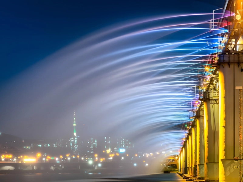 The Moonlight Rainbow Fountain is a distinctive element of the Banpo Bridge, which was built in 1982 following two years of development. According to Guinness, this fountain is the longest bridge fountain on the planet. Ten thousand LED lights stretch along its two 347-foot sides. 190 tons of water are released by the fountain per minute.
