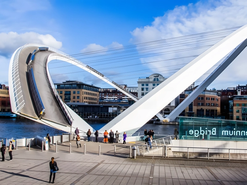 The Gateshead Millennium Bridge spans the River Tyne and is designed for cyclists and pedestrians. It links the Gateshead arts district with Newcastle upon Tyne’s Quayside. The architects Wilkinson, Eyre, and Gifford designed the building. Because of its slanted design, the bridge is also known as the “Winking” or “Blinking Eye Bridge.”