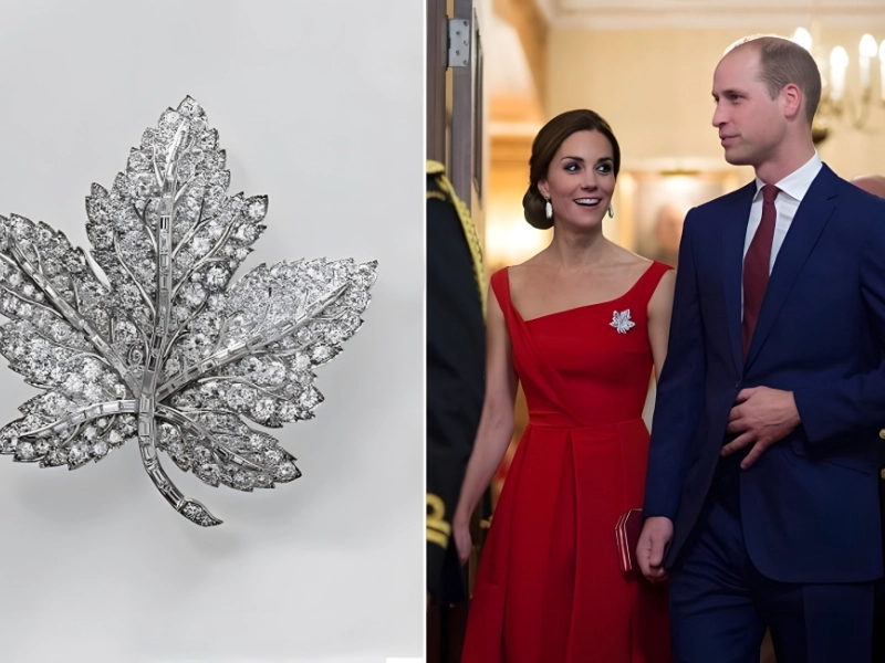 One of Her Majesty’s largest brooches, the Canadian Maple Leaf Brooch, was originally owned by Queen Elizabeth II and was worn by Kate Middleton. It is sliced into the form of the sugar maple, or Acer saccharum, which is Canada’s national tree. Since 1868, the maple leaf has represented Canada.