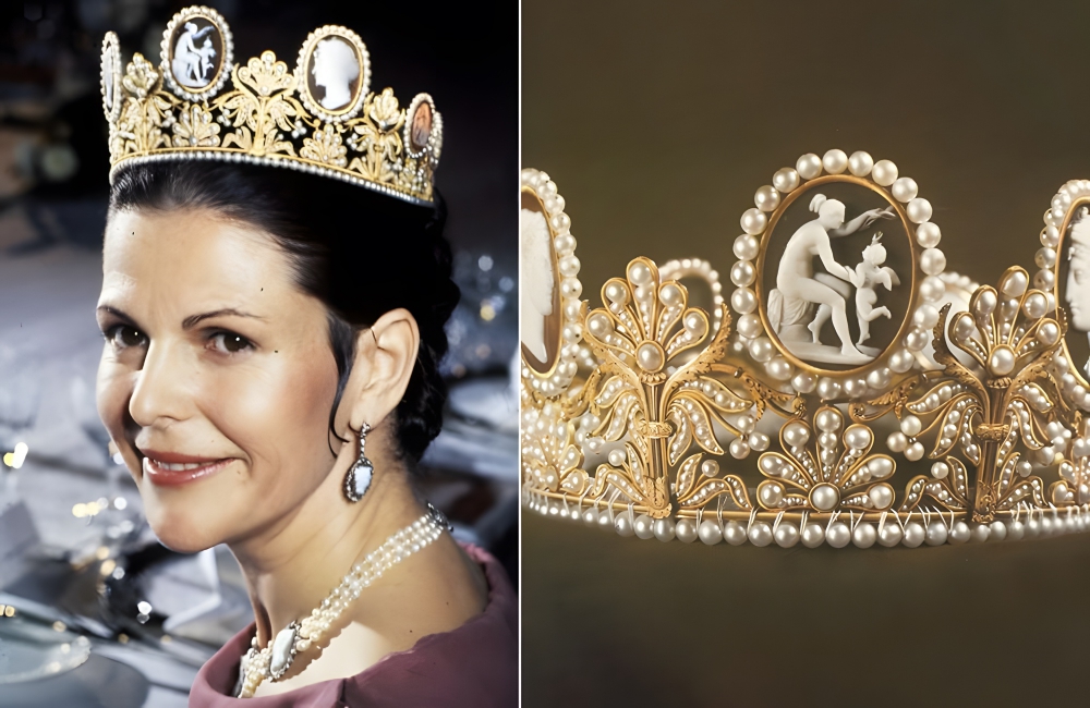 The Cameo Tiara has seven cameos (oval-shaped carved portraits). Each cameo in the Tiara was made individually, and they were never intended to be made as a set, which is why they are so different in size and appearance. The Cameo Tiara has become a treasured part of the Swedish Royal jewel vaults.