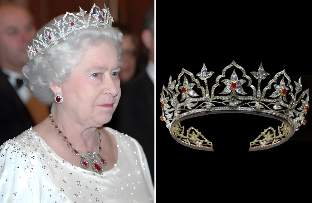 The Oriental Circlet Tiara consists of more than 2,600 diamonds set in gold with opal accents. Opals were one of Prince Albert’s favorite stones, and Queen Victoria, the original owner, also had an opal brooch, earrings, and necklace commissioned to accompany the Tiara. The Tiara passed to Elizabeth II as years went on.