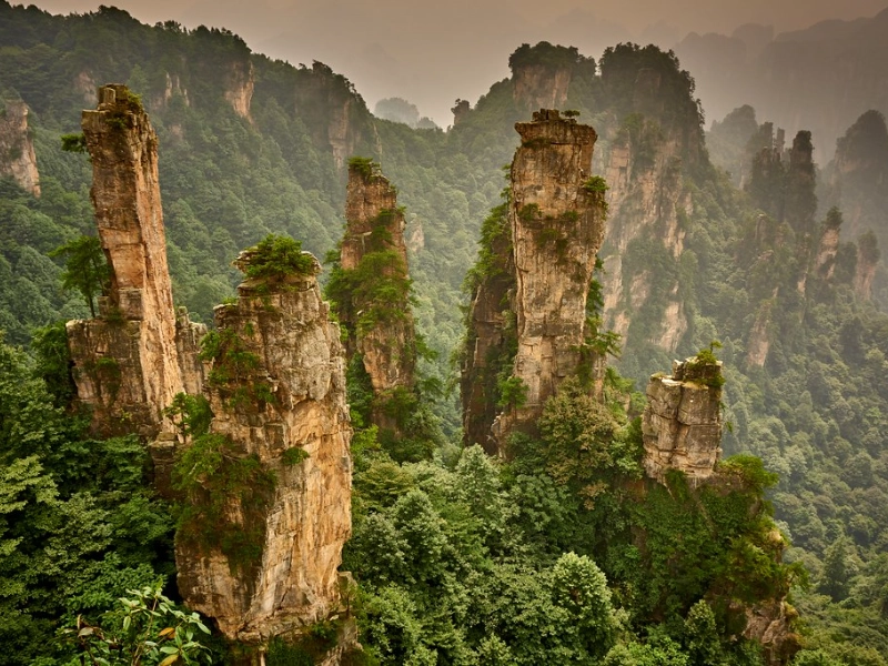 The most striking elements of the park are its tall quartzite sandstone pillars, some of which stand more than 200 meters (656 feet). Often covered in mist, these pillars produce an almost magical environment that gives the appearance of a landscape right out of a fairytale world. Millions of years of geological processes like uplift, erosion, and weathering produce these “avatar mountains” or “stone forests”.