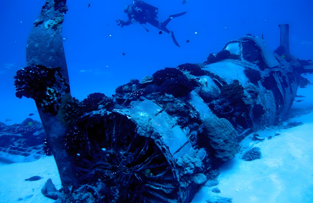 One F4U was on a routine mission when something went wrong with the engine. The pilot landed it in the water and ejected safely. The plane wasn’t damaged, but it immediately began to sink. The F4U’s bomber days are long past, but it is now home to quite a dense garden of eels and sea creatures.
