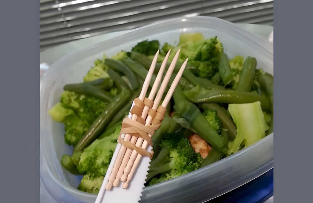 Attached to a plastic knife are four toothpicks, and they’re chained to the knife by rubber bands. This must have taken five or ten minutes to construct, by which time most of us would have given up and begun eating with our hands. So, we applaud the dedication.