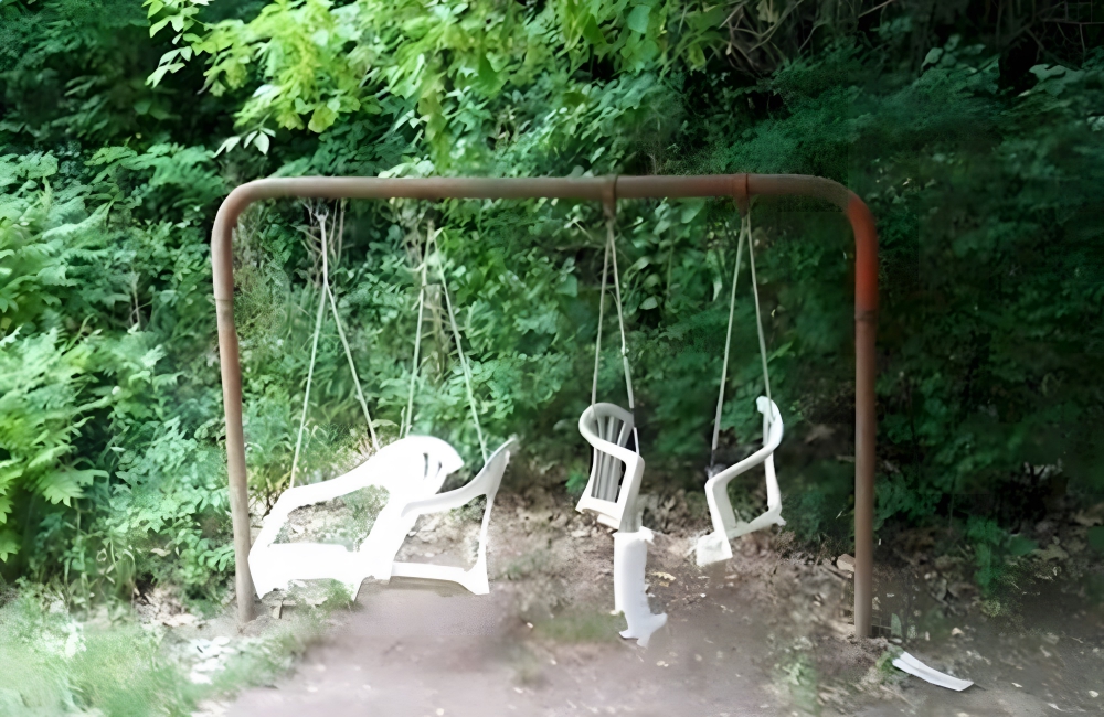 This is the swingset version of the white van with the words “FREE CANDY” on it. One DIY’er decided to forgo the ridiculous price of swingsets and installation and instead attach broken lawn chairs to a rusted-out frame.