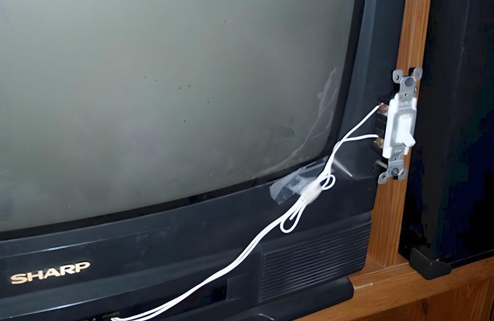 The engineering skill required to accomplish this is way more impressive than someone going out and spending $600 on a new TV. Light-switches like this one cost under $1 and 90s-era TVs cost $130-$140. Someone managed to connect a Sharp-brand television from the nineties to an actual light switch. Assumedly, when you flip the switch, the TV turns on.