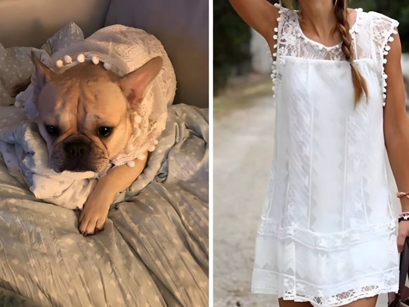 One buyer purchased this inexpensive garment from AliExpress, only to discover that it was better suited to her dog. The white summer dress fit the dog quite well, but she doesn’t seem overjoyed with her new costume.
