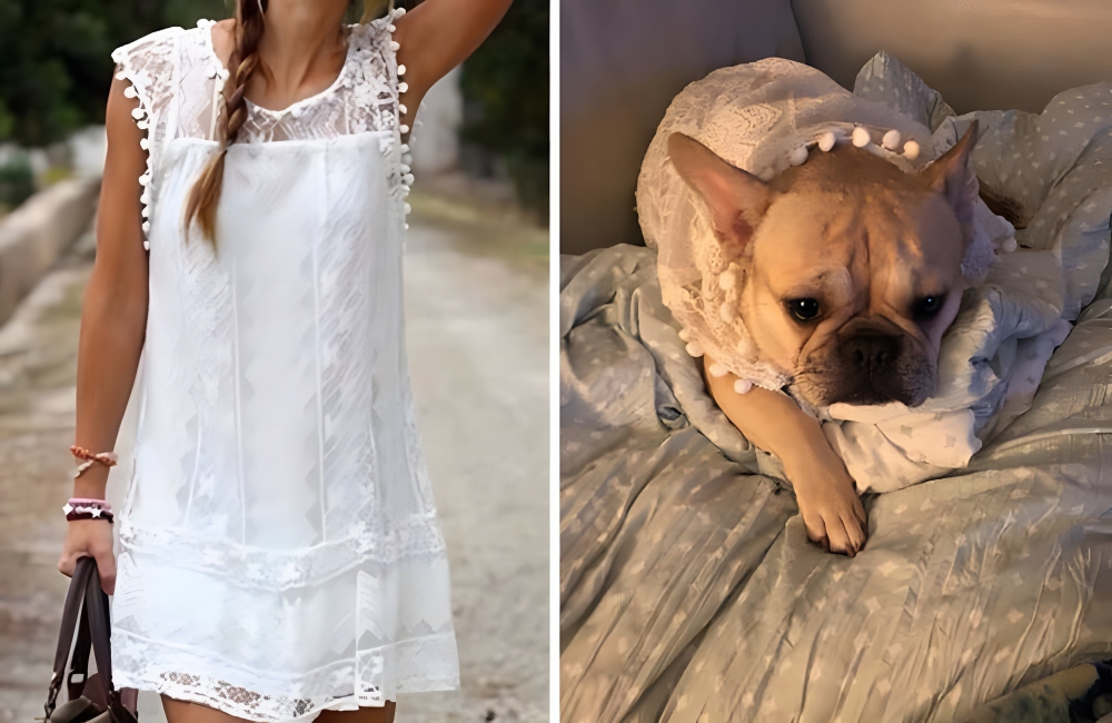 One customer bought this bargain dress from AliExpress, only to discover that it was better suited to her dog. The white summer dress fit the pup remarkably well, but even the dog doesn’t look over the moon with her new outfit.