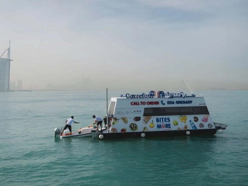 Consider food shopping to be a terrestrial activity. In Dubai, supermarkets have transformed into aquatic entities. Welcome to Carrefour Bites & More by the Shore, a floating supermarket that serves you directly on the water. You can get fresh food, drinks, ice cream, hot and cold snacks, and even necessities like sunscreen and medication without ever having to set foot on land, thanks to a variety of things that range in price from $5 to $20.
