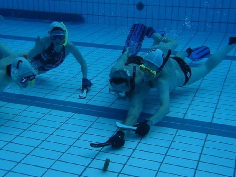 El hockey sobre hielo tiene un toque único con el hockey subacuático. En este juego, los participantes utilizan pequeños palos para mover el disco por el suelo de la piscina. En esencia, cambia la amenaza de un disco de patinaje a la dificultad de sumergirse durante períodos prolongados de tiempo.