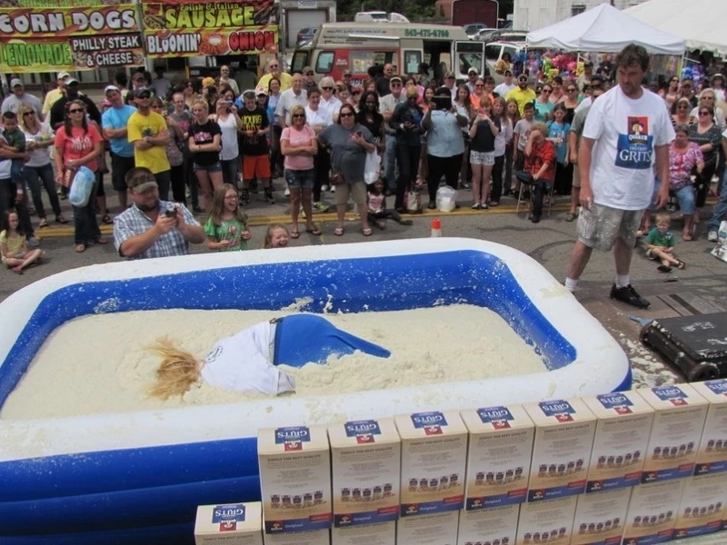 Durante las competiciones de natación con sémola de maíz, los participantes se sumergen en una piscina llena de sémola de maíz. Cada participante tiene diez segundos para recoger la mayor cantidad posible de sustancia espesa. Los competidores son pesados antes y después de nadar. El ganador es el que tenga más arena.