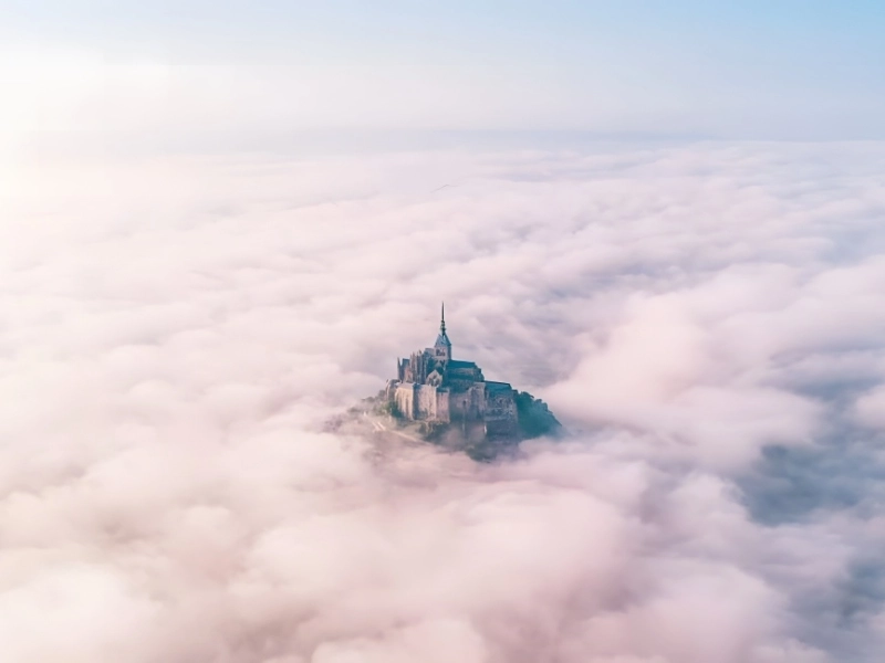 You may definitely infer that Konrad Paruch, who goes by @thedronelad on social media, used a camera other than a standard one to take this stunning picture. Paruch captured a picture of the French island of Mont Saint Michel from a great height, captured through a sea of clouds using a drone.