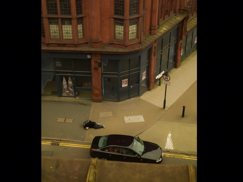 In order to “demonstrate…the daily collisions” between people’s “inner selves” and the “everyday reality” that results from “urban city living,” McIlvaney took the picture. The picture shows someone unconscious, curled up in a fetal posture, on the sidewalk. The person looks miserable, suffering on the ground by themselves, and it doesn’t appear like anyone is trying to aid them.
