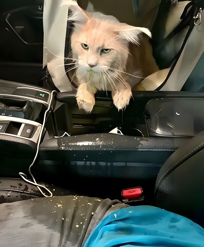 The cat clearly does not find the circumstances satisfactory. And even if you cannot see the owner’s face, they most likely are reflecting the image. Two dissatisfied beings. The incident in the car represents the ideal storm of pet ownership difficulties. Already nervous about being outside its comfort zone, the cat has made a mess that makes everyone more uncomfortable. The bad scent permeating the small auto space is nearly audible. The owner is probably divided between annoyance at the cleaning chore ahead of them and pity for their pet. This event emphasizes the erratic character of traveling with animals and the patience needed of pet owners. It reminds us of the close relationship between people and their pets; despite the mess and trouble, the owner keeps on getting their kitty buddy the required medical treatment. The circumstances most likely resulted in a frenzied hunt for cleaning materials and a mental note to pack a pet carrier the next time. Pet owners may start talking about recommended procedures for moving animals and getting ready for unplanned events on car rides once this scenario becomes a cautionary story told among them.