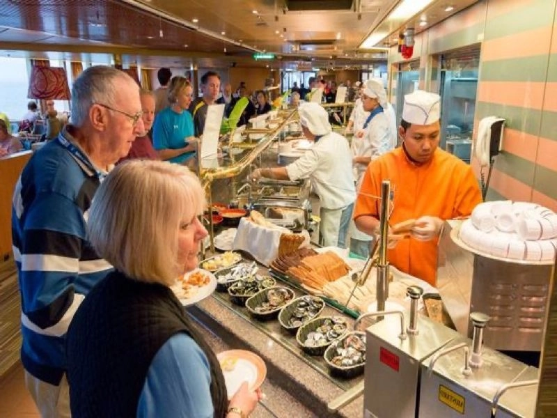 Dann kam die Realität: Auf einem Kreuzfahrtschiff wird der Großteil der Mahlzeiten in der Cafeteria eingenommen, obwohl dort viele andere Gäste anwesend sind und die Küche im Allgemeinen recht gut ist. Auf jeden Fall ist die Erfahrung gut, vor allem angesichts der Aussicht, aber wie ich bereits sagte, sind hier immer viele Leute.