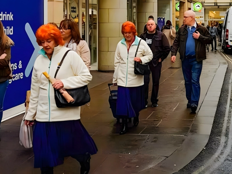 Estas dos mujeres parecen extrañas ya que se están separando, una delante de la otra, pero usan las mismas botas, tienen el mismo cabello naranja intenso y están vestidas de manera idéntica.