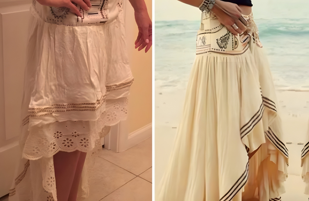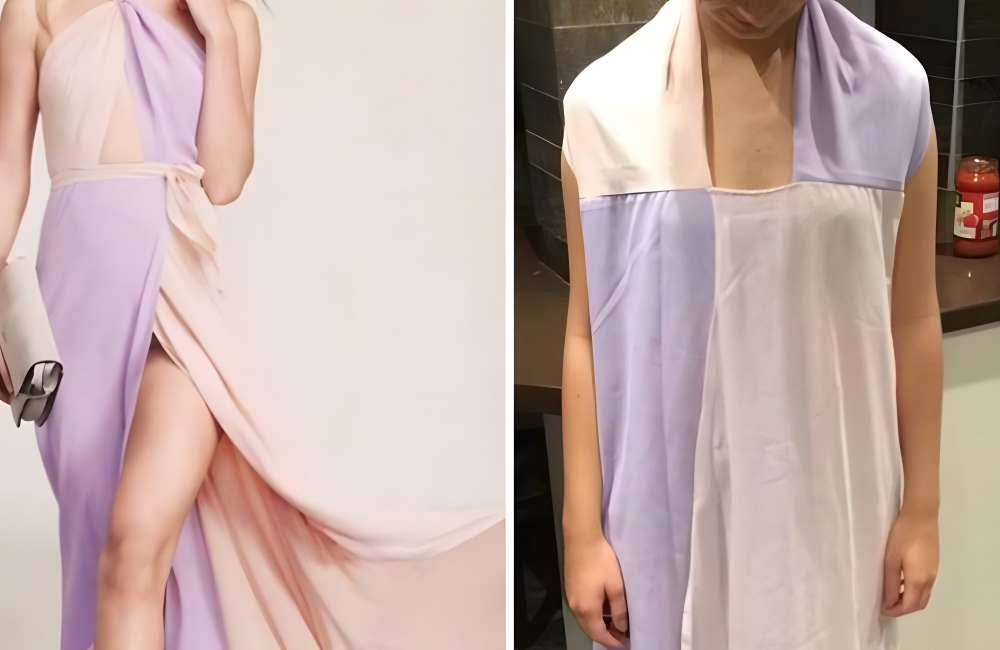 We’ve seen this a lot on this list. A dress will be advertised that is voluminous and stylish, but, when the skirt is actually received, it hangs flat. There is so much wrong with this purchase, which was shared on Knock Off Nightmares, a Facebook page.