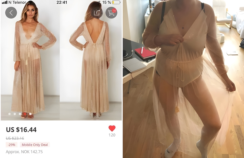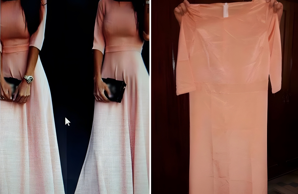 While we can’t confirm whether that’s true or isn’t, what is for sure is that this dress looks terrible. The peach maxi dress looks nothing like the one advertised, as the knockoff is cut more like a hospital gown. What’s worse is that one of the commenters said that she ordered “the same dress” for a “holiday party” years ago and got the “same mess.”