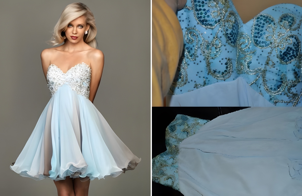 Instead, the pink was more of a salmon than a bubble gum shade. The manufacturer also neglected to state that the top part was totally see-through. The knockoff website clearly skimped when it came to the shiny sequins. Prom dress shopping can be a lot of fun—just don’t do it online.