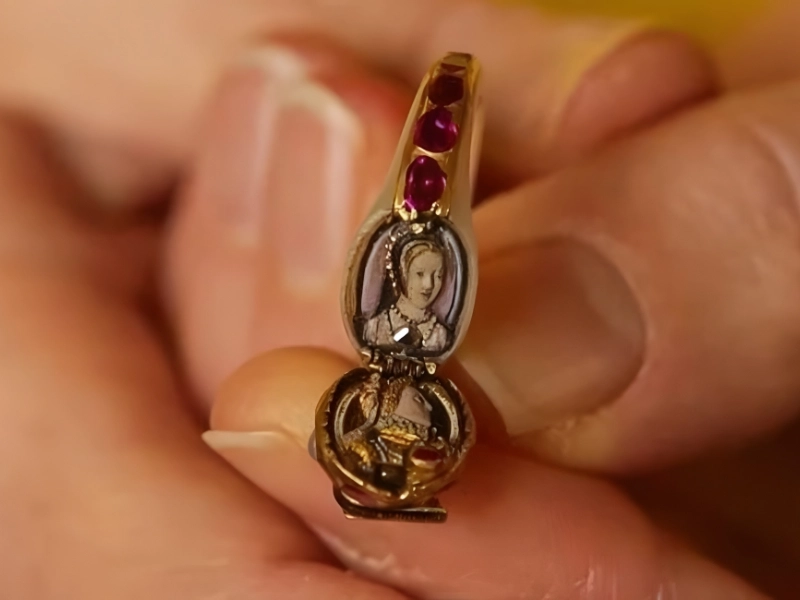 One of the few remaining pieces of Tudor-era jewelry, the Chequers Ring, is a bit of a mystery. The ring, which dates to the middle of the 1570s, has a mother-of-pearl set in gold and rubies. There is a locket on the ring. On one side, Queen Elizabeth I is shown.