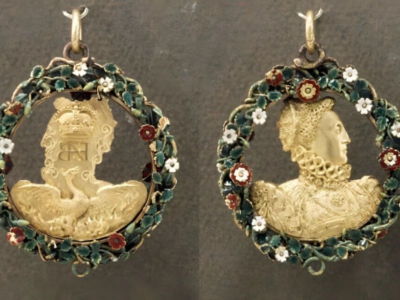 The British Museum is presently the home of the Phoenix Jewel. The main wearer of the jewel, Queen Elizabeth I, is depicted in a bust on this gold pendant. The jewel, on the other hand, shows a burning phoenix beneath the regal crown and rays monogram. A wreath of green-stemmed and leafy white and red Tudor roses encircles the whole jewel.