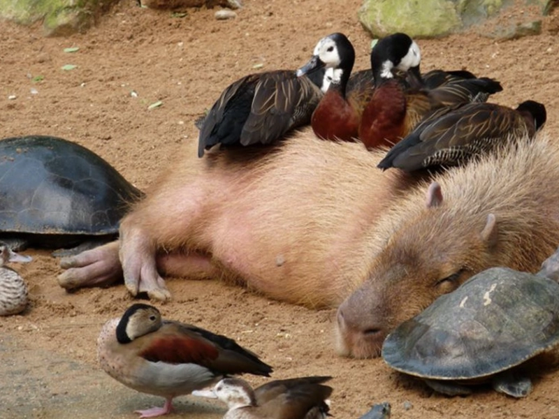 Capybaras have shown amazing capacity in both natural and controlled habitats to create amicable interactions with different deer species.Often sharing grazing grounds and water supplies, these herbivorous mammals form a cooperative relationship that helps both of their species.Often serving as sentinel animals, the larger capybaras benefit their deer friends by virtue of their increased awareness of predators acting as early warning system.Deer, meantime, support the relationship by spotting possible hazards from several directions.This cooperation shows how several herbivorous species may cooperate to improve their chances of survival by means of resource sharing in peace.