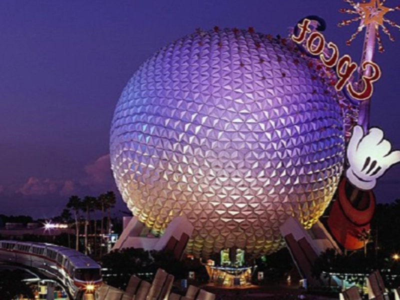 The futuristic sphere Spaceship “Earth” and the monorail are visible to guests at this park, which is housed within the Walt Disney World Recreation Center in Florida.