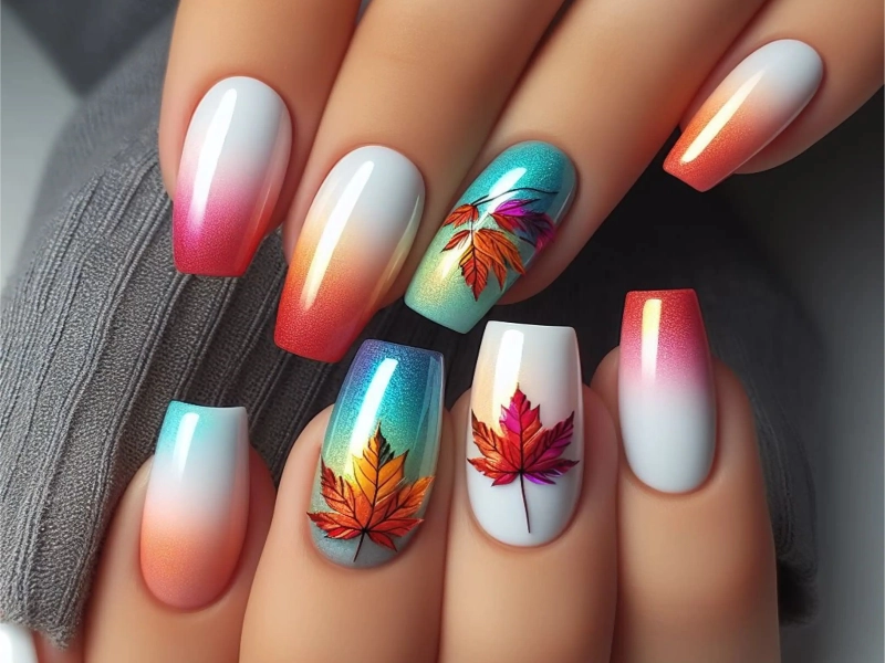 Stunning ombre design that moves from warm orange to rich brown will help you to capture the feeling of falling leaves. This method calls for precise colour mixing to produce a smooth gradient that replics the natural autumn leaf development. Starting at the cuticle with a light orange base, progressively mix into darker amber tones and conclude with a chocolate brown at the tips. A perfect transition between colours depends on dabbing the colours together using a cosmetic sponge while they are still wet. While a high-shine top coat brings the whole artwork to life, adding a scattering of fine gold glitter can replicate sunlight catching dropped leaves. This approach can be modified for lesser lengths too, but it works especially nicely on longer nails where the gradient has more room to develop.