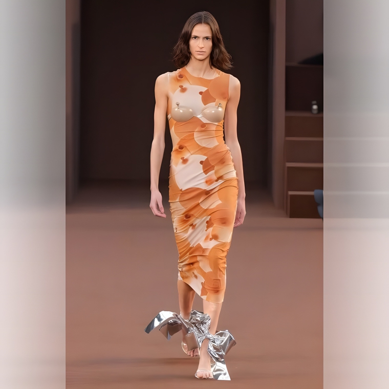 Other than the two suction cups with strange valves coming right out of them where the model’s bra should be, this dress would definitely fit in a piece of desert camo reserved for super, top-secret agents and James-Bond-like spies. But those suction cups are quite the discrepancy, especially when you’re trying to camouflage yourself. Didn’t this lady learn anything in camouflaging 101? You’ve got to blend in with your environment.