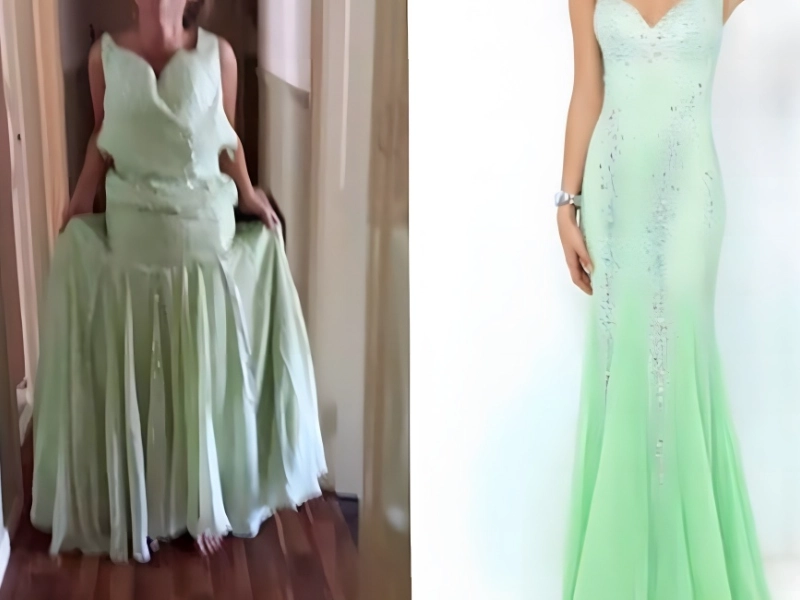 Mint green ombre may be a little daring for some, but this $500 Sherri Hill design struck a chord with one shopper after they discovered a knock-off on Wish for a tenth of the price. As you might expect, the Wish version made the consumer resemble an overturned ice cream cone rather than a stone-cold fox.
