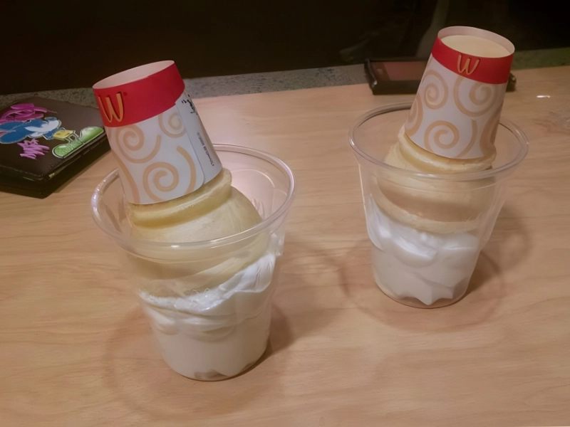 Well, this worker gets major credit for creativity. Instead of cones, these diners requested two scoops of ice cream in cups. But what they received was a strange concoction of the two that was completely nonsensical.