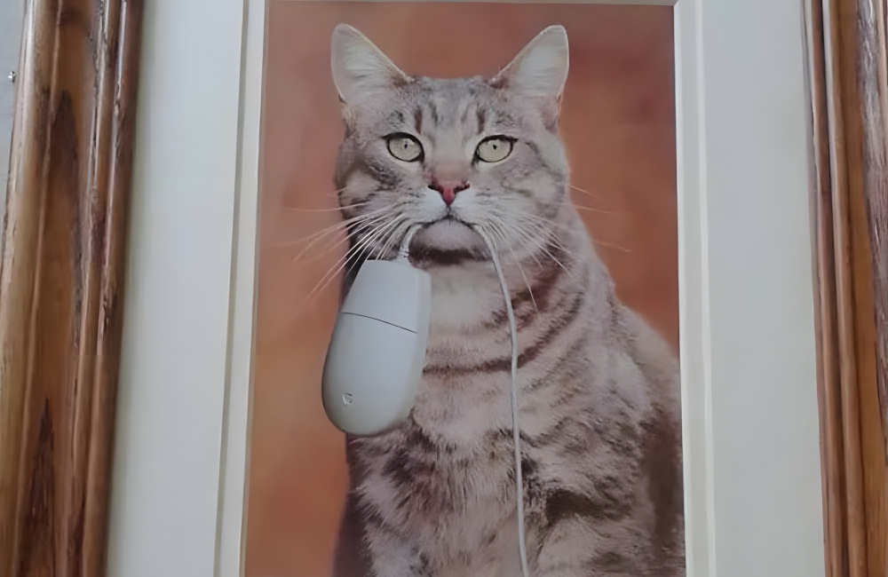 Cat and Mouse Picture @FrikkinMisfits / Twitter.comWhile the description might make this picture sound like a bloody mess, the mouse in question wasn’t some helpless critter. It was a computer mouse, with a cord dangling where the “tail” would be. When it comes to art found in a thrift store, we have to say that this is one of our favorites so far.