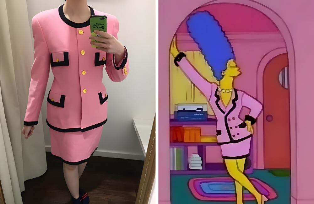 Marge Simpson @boredpanda / PinterestThe black cut-out pockets and trim are almost identical, and the only real difference is the collar. As the shopper said, it was an “amazing ensemble.” All that was missing was the blue bouffant and matching pink heels. The bright-pink Chanel suit was found on a discount rack in the Simpsons, just like this knockoff was found at an “op shop.”