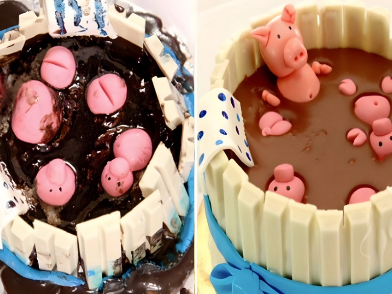 However, as everyone knows, when it comes down to the finer points, things don’t always go as planned when you take inspiration from Pinterest, Snapchat, and other places. It appears as though the pigs in the knockoff are drowning rather than swimming in chocolate.