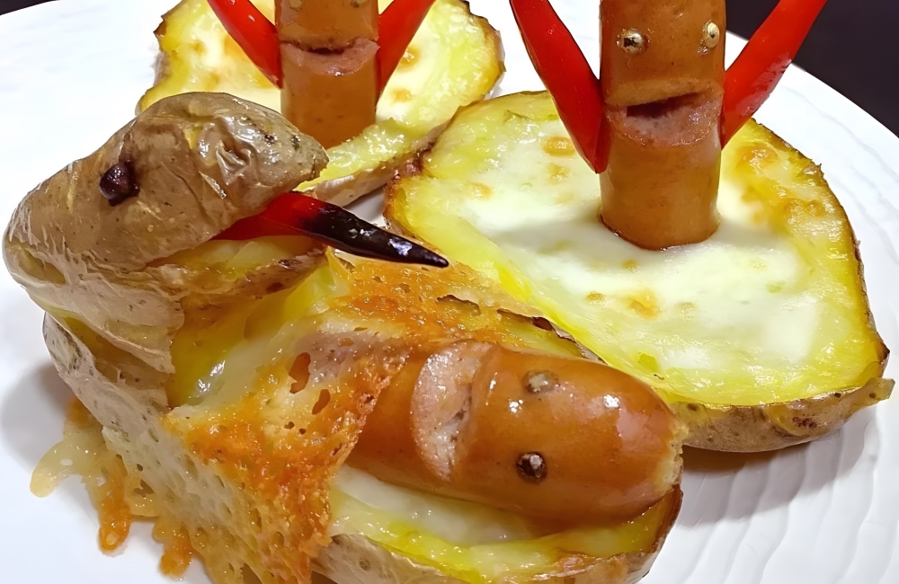 Making food into fun creations like this is always exciting, especially when you have kids around the house. This person wanted to present a scene from a sci-fi action film using potato skins, cheese, chilies, and sausages; however, it turned out to be a little creepier than intended.